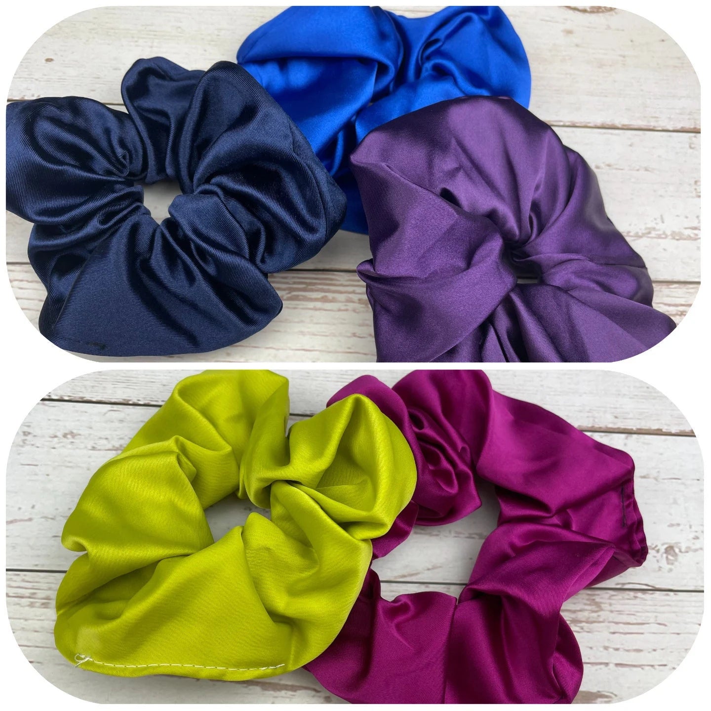 Handmade Satin Scrunchie with Bow - Colorful Hair Accessory in Parliament Blue, Purple, Dark Blue, Green, and Fuchsia